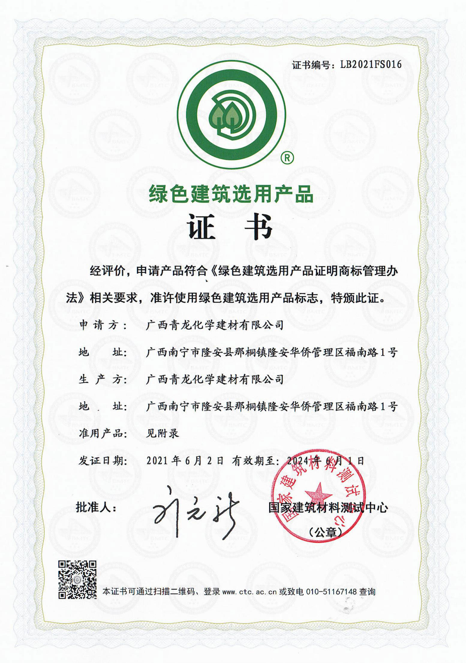 绿色建筑用用产品证书
