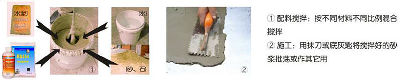 3、配制混凝土或砂浆时,将砂、石、水泥及水在搅拌机中先直接搅拌,再加 对应比例的防水剂继续搅拌均匀即可;